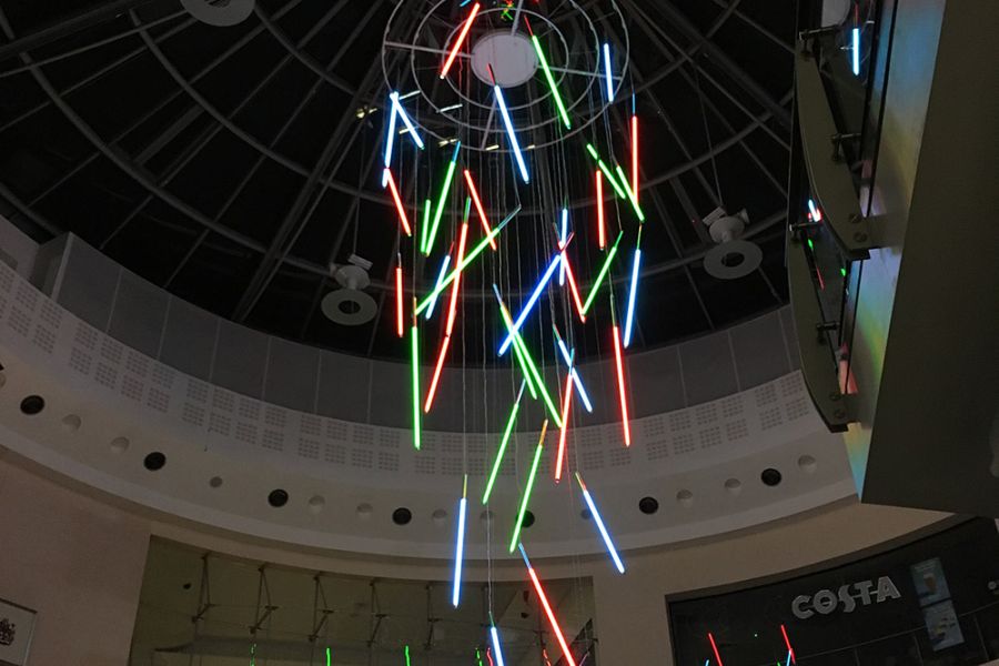 James Glancy were commissioned to create a colourful chandelier in the atrium within the Uxbridge shopping centre.